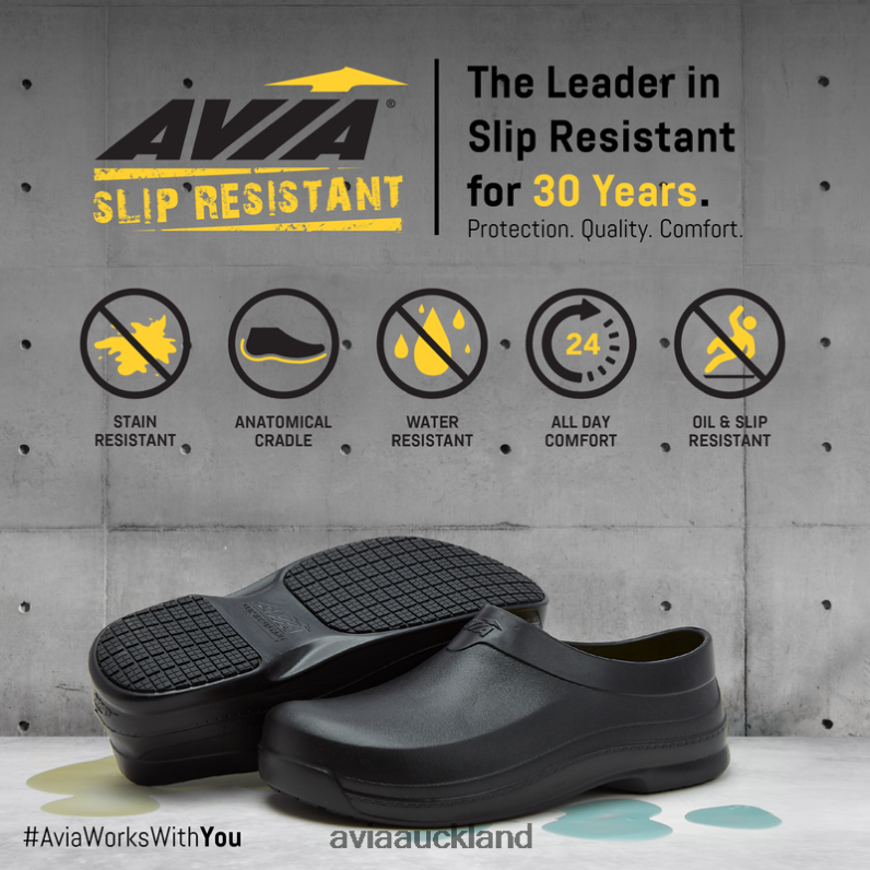 The new Avi-Flame is ideal for food service workers who prefer a slip-on clog style. These Avia slip resistant work shoes for men have a thick rubber sole with an oil and slip resistant tread pattern for enhanced grip, specifically designed to prevent trapping of oil and liquid, and to secure sure footing in slippery environments like restaurants, hospitals and kitchens.